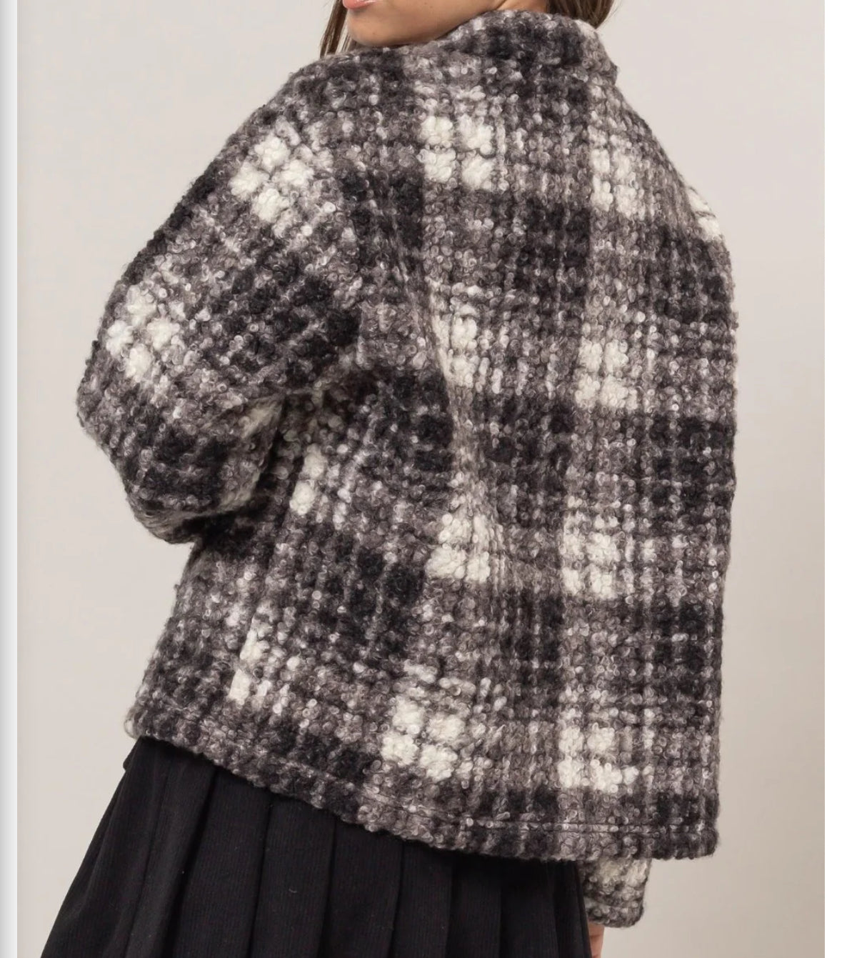 Plaid Button Up Boucle Jacket is a fashionable choice this season. It combines classic vintage design with cozy and warm fabrics to keep you stylish in cold weather. It can be matched with a variety of clothing to show personal charm, so that you can radiate confidence and taste in daily life.
