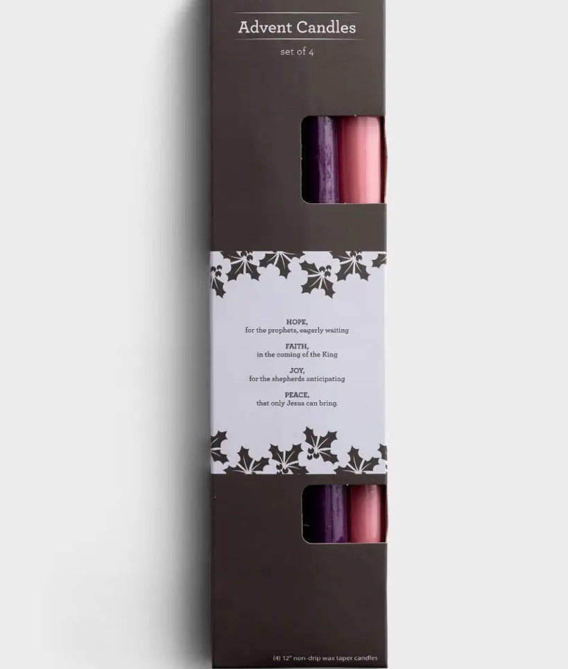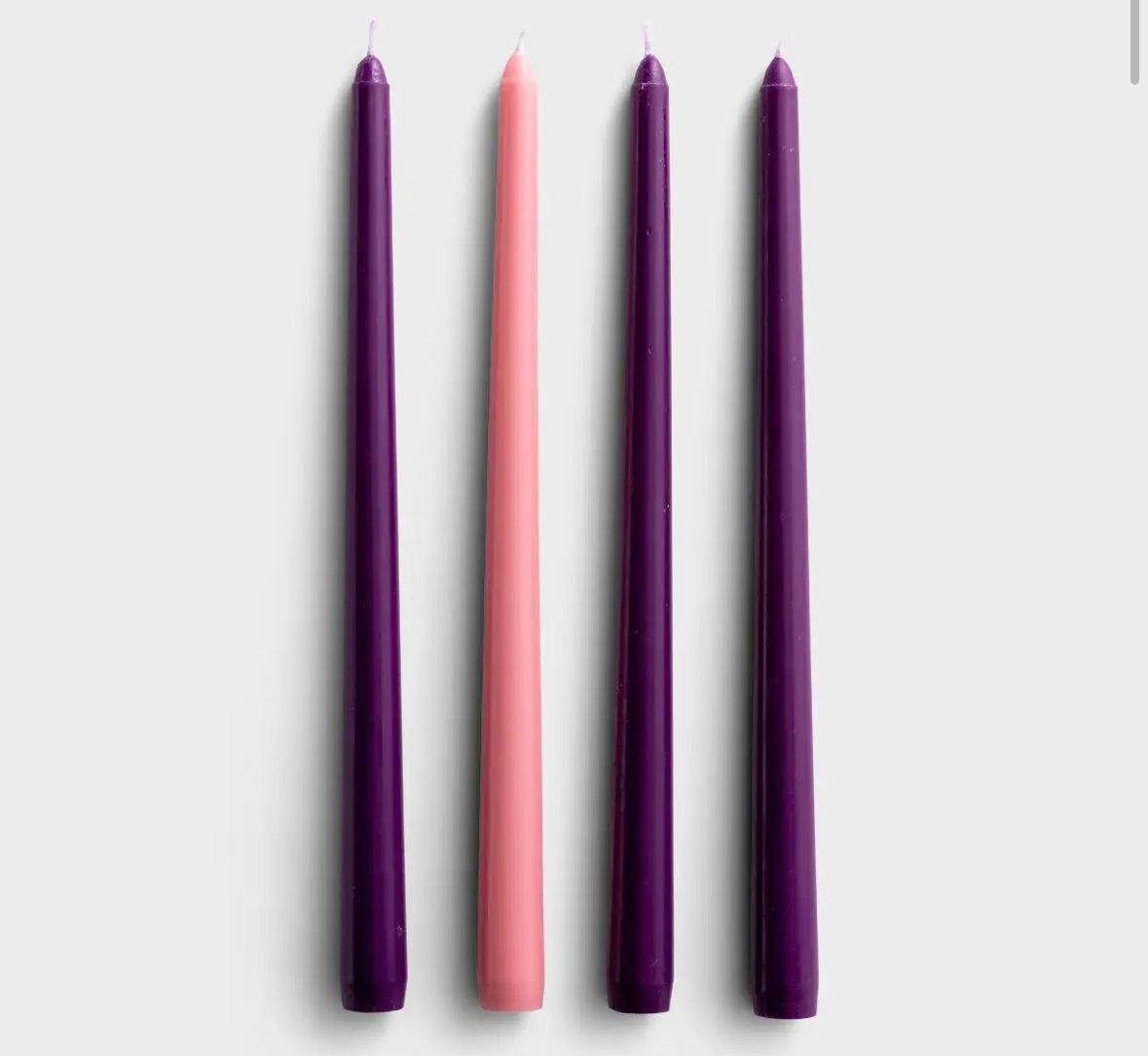 This set includes four 12" non-drop wax taper candles, 3 purple and 1 pink, to represent the weekly celebration of Advent leading up to the birth of Jesus.