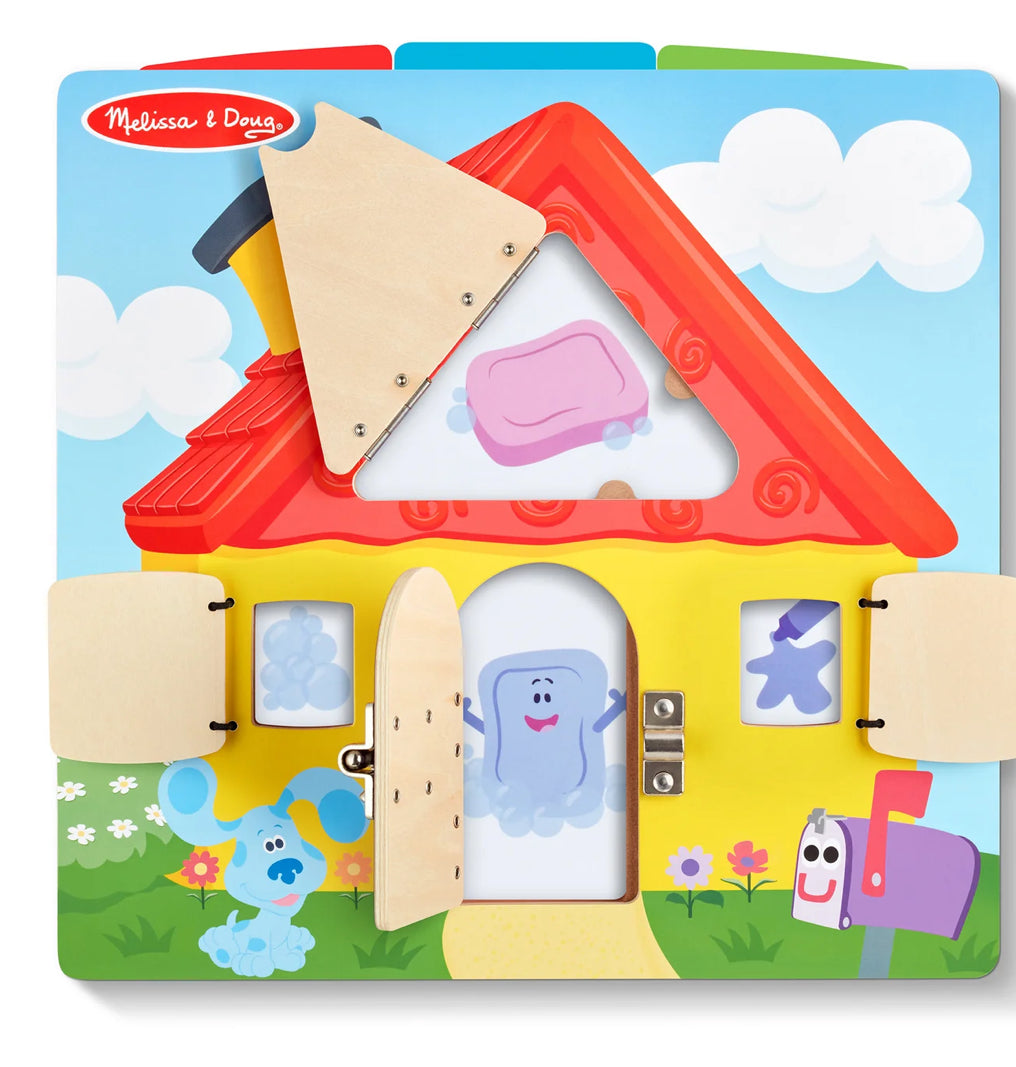 - Slide a card into the wooden activity board; then, lift the flaps to discover clues; unlatch the door to reveal who’s here to play with Blue